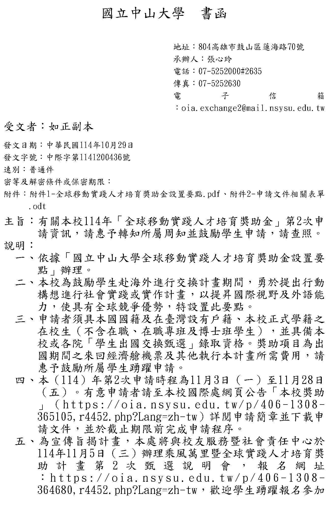 公告本校114年「全球移動實踐人才培育獎助金」第2次申請
