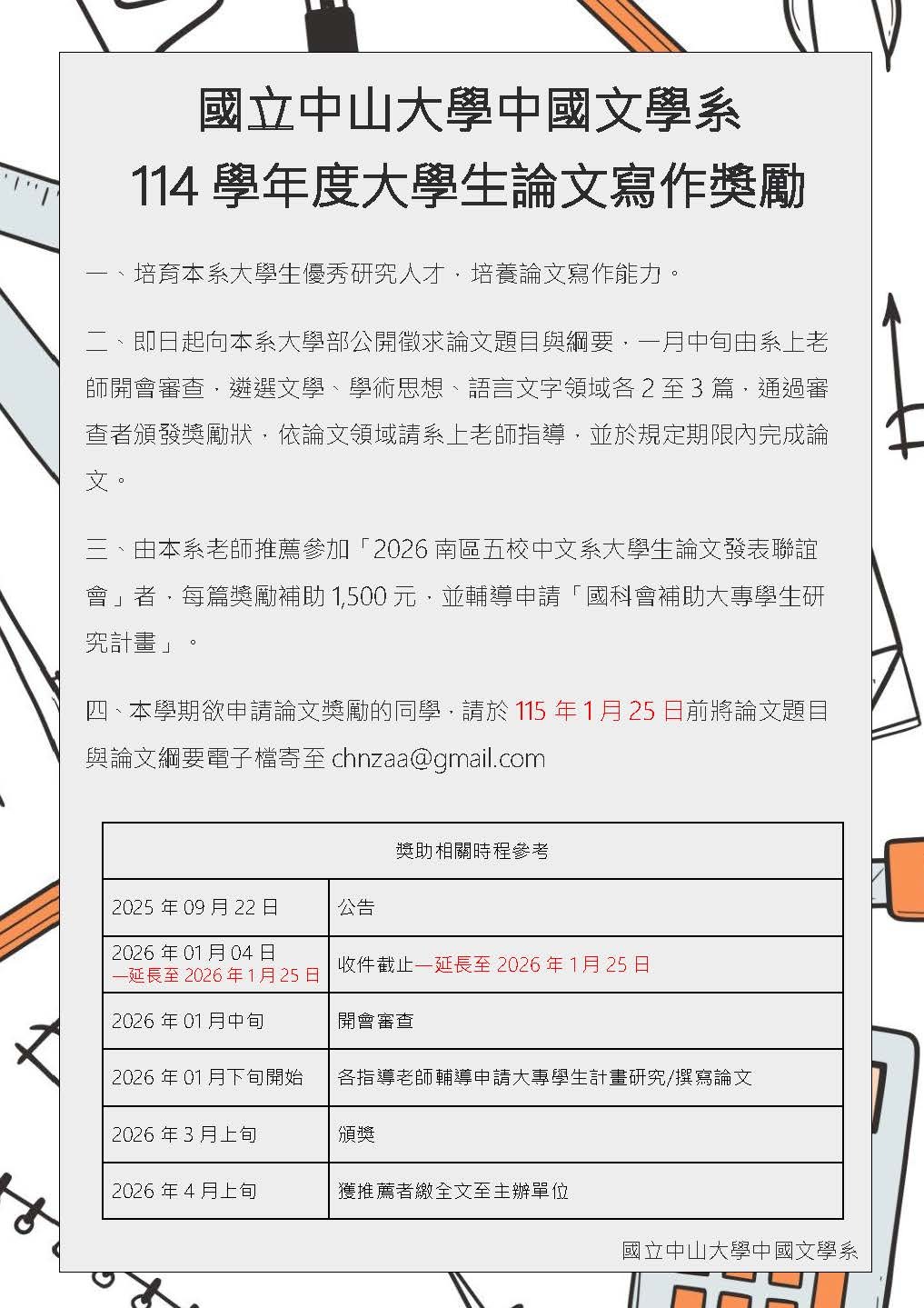 【公告】114學年度大學生論文開始囉,延長收件至115/01/25止